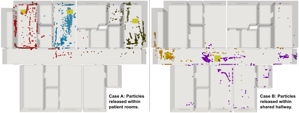The simulation results at right were performed by one of my co-authors and show that particles released from one room can travel to another, and that particles released from the hallway can travel into a room. With this, we were able to advise that the doors in the ward should be closed at all times (already in practice) and that healthcare workers should not remove their protective gear at any location in the ward.