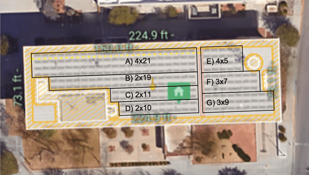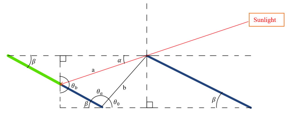 The line indicated by the letter ‘a’ represents the distancβe from the top of the first solar panel, to the point it hits on the next panel. This distance will change throughout the evaluation and based on the values found earlier, can now be found using the Law of Sines a/sin(θa)=b/sin(θb).